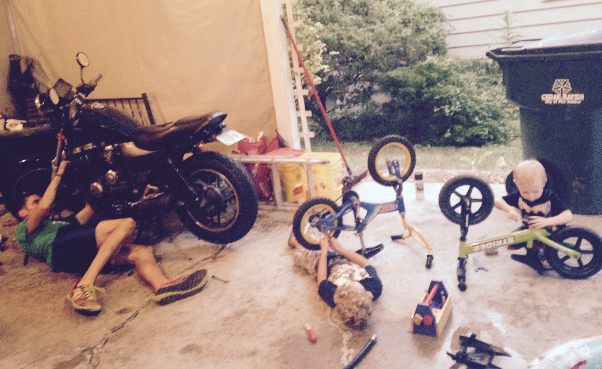 Boys and bikes – note my shoes are from WS100 … perfect garage / lawn shoes now!